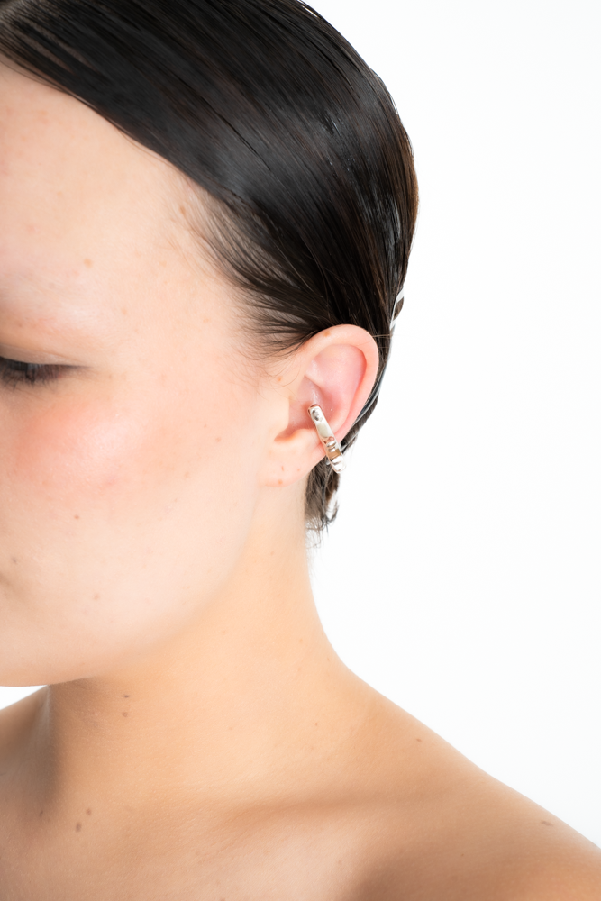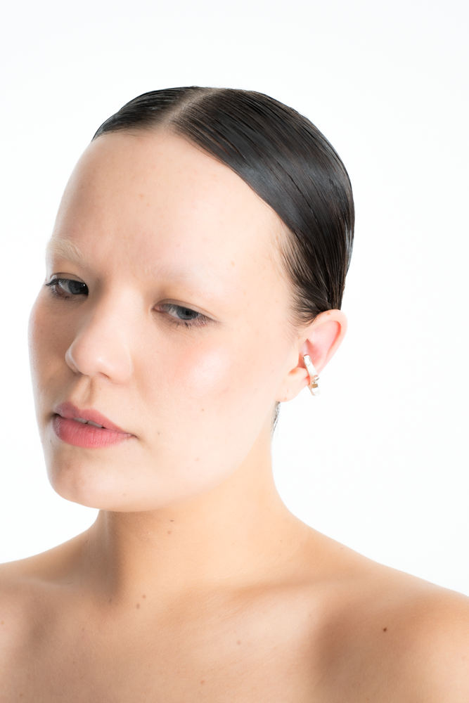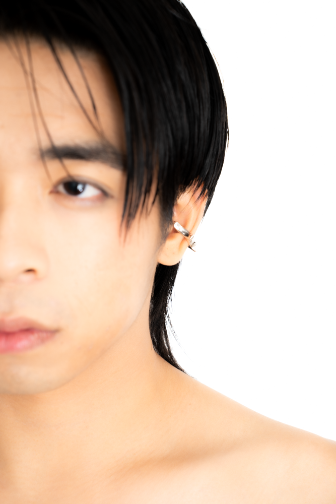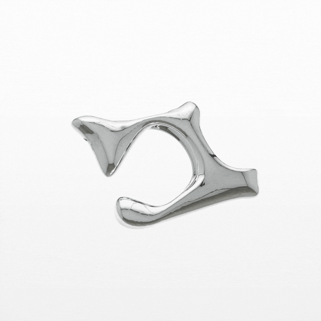 The M Valley Arch ear cuff is a sculptural form born from a celestial discovery in the digital world of M Valley. Inspired by a mysterious arc found in the sky—an ever-shifting structure of energy—it connects the world’s galaxy in constant rotation. This form is first seen by the Octopus Teacher, a digital monster and guide to Alvin, who recognises it as a distorted echo of nature, alive and in motion.