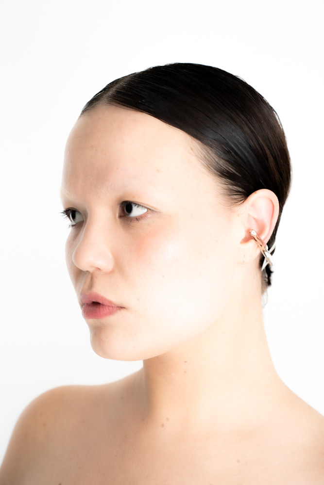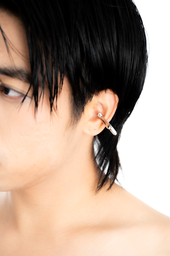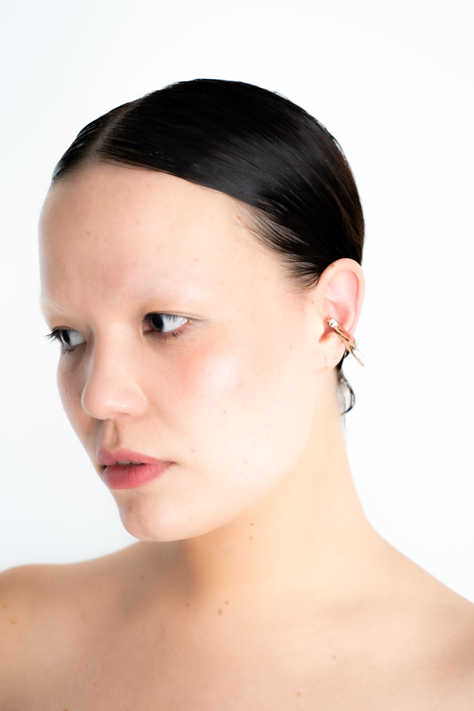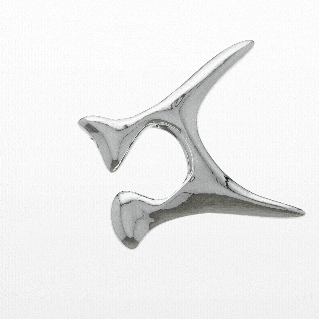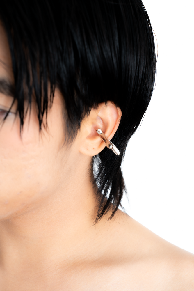 The M Valley Arch ear cuff is a sculptural form born from a celestial discovery in the digital world of M Valley. Inspired by a mysterious arc found in the sky—an ever-shifting structure of energy—it connects the world’s galaxy in constant rotation. This form is first seen by the Octopus Teacher, a digital monster and guide to Alvin, who recognises it as a distorted echo of nature, alive and in motion.